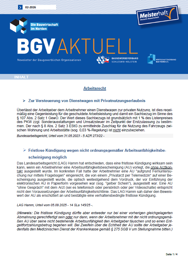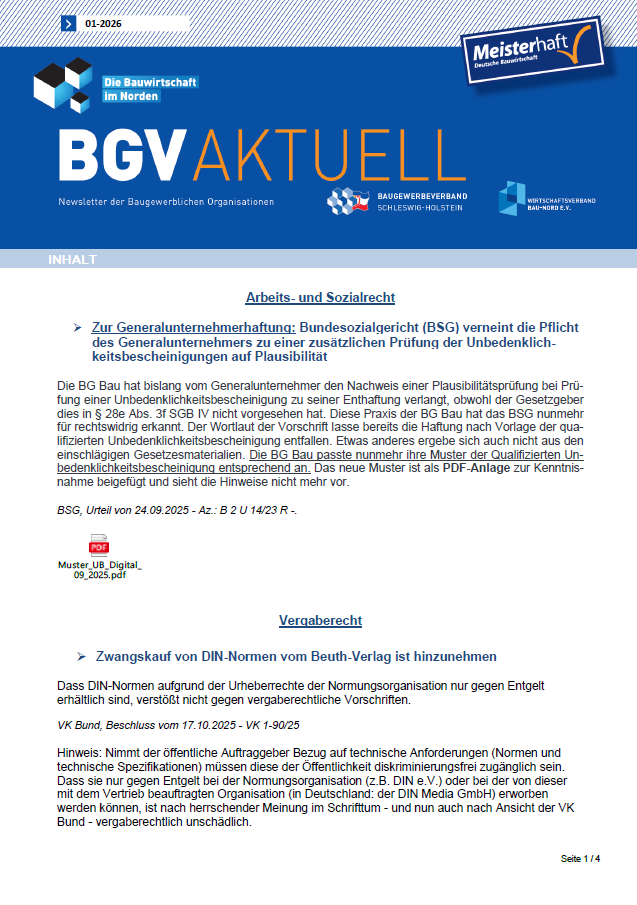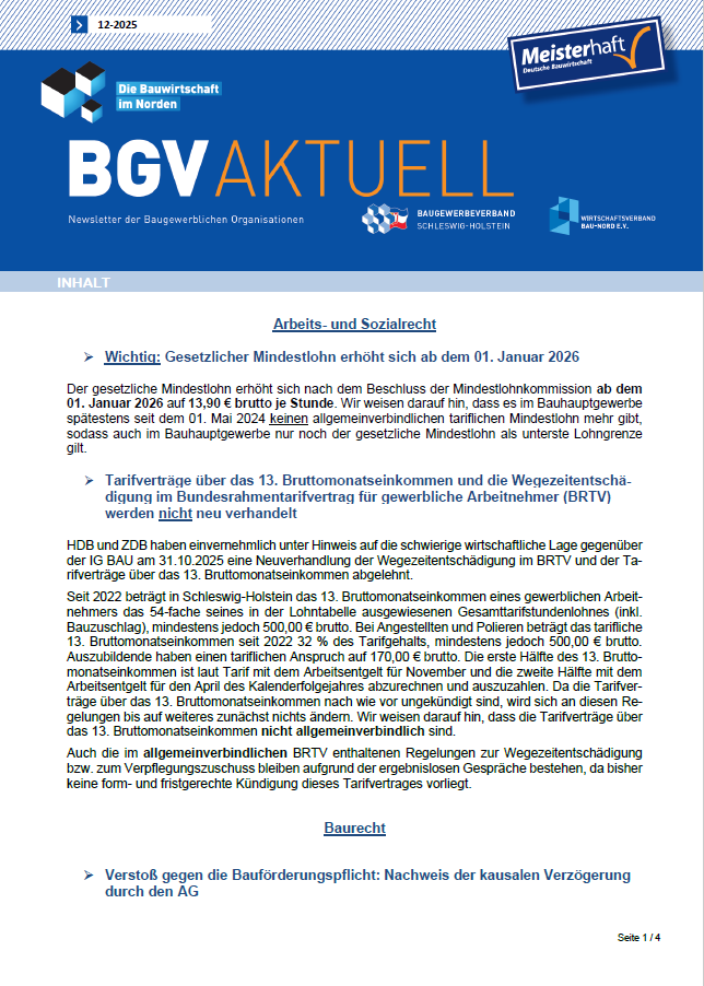 Mit dem monatlich regelmäßig erscheinenden BGV Newsletter informieren wir Sie über alle Themen des Bauhandwerks. So bekommen Sie wichtige gesetzliche Neuerungen übersichtlich zusammengefasst von unseren Rechtsanwälten. Wichtige Informationen aus dem Arbeitsrecht, Baurecht, Bautechnik, dem Holzbau und Beiträge zu Nachhaltigkeit sowie Digitalisierung am Bau u.v.m.